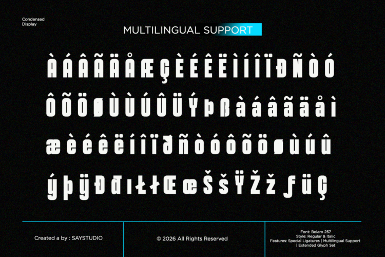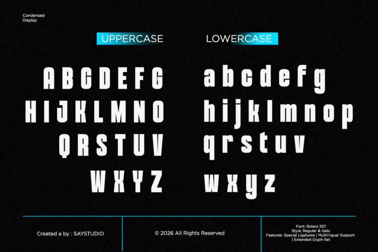BOLARO is a bold condensed display font crafted to deliver strong visual impact, sharp character, and modern confidence. Inspired by contemporary editorial design and urban typography, this typeface is built to stand out, offering powerful vertical proportions, clean geometry, and striking readability that commands attention across digital and print media.