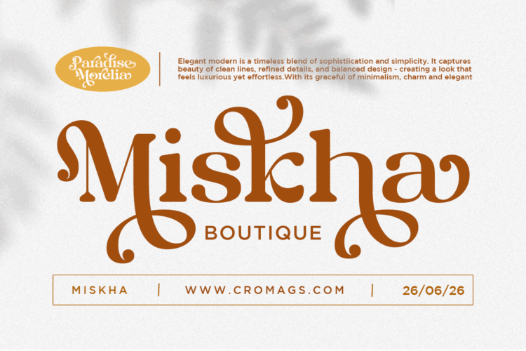 Paradise Morelia is a decorative elegant font featuring expressive curves, artistic swashes, and a luxurious vintage flair. Designed for standout branding, editorial titles, logo designs, packaging, wedding invitations, and creative projects seeking a bold yet refined aesthetic. Its unique ornamental style brings a touch of sophistication and artistic charm, making every layout look premium, stylish, and unforgettable.
