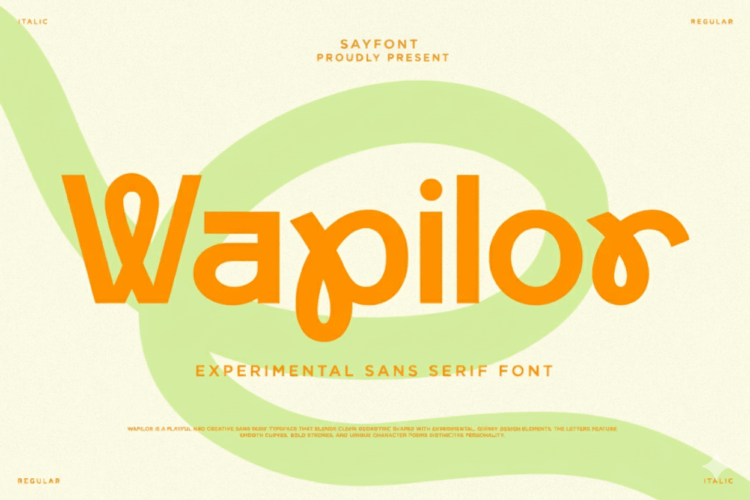 Wapilor is an experimental and distinctive font featuring elegant curves and a modern visual aesthetic. Designed to make your projects stand out, Wapilor brings a stunning and captivating look to any design.